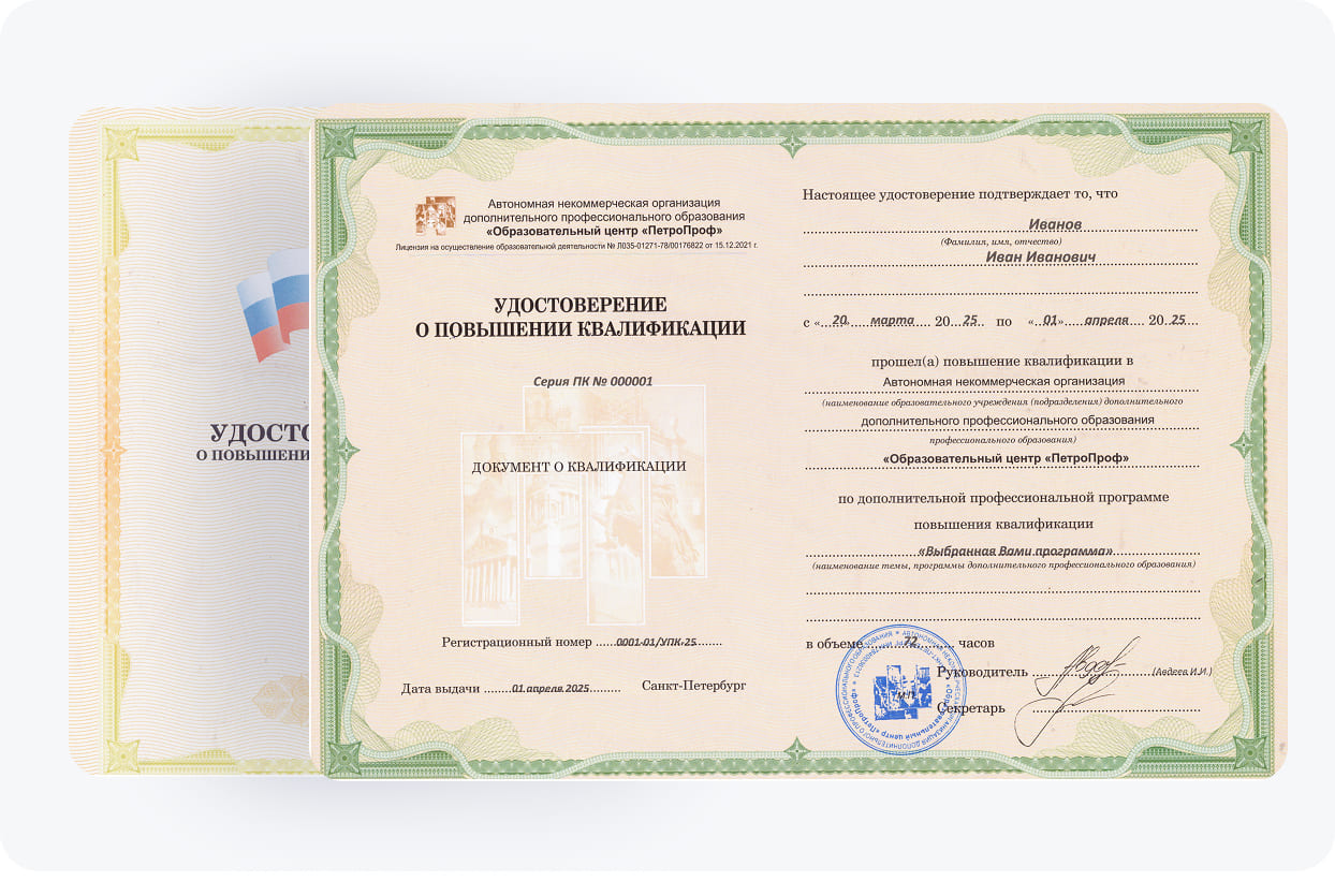 Пройдя обучение по Педагогике в нашем учебном центре "ПетроПроф", студенты получат важные результаты для ведения деятельности. Они обретут актуальные навыки и знания для преподавания и воспитания учеников разной возрастной категории, изучат новейшие методики, научатся составлять планы в соответствии с действующими стандартами. Также специалисты смогут разрабатывать структурированные и удобные планы-конспекты уроков или занятий. После окончания курса все выпускники получают диплом. Этот документ отражает приобретенные компетенции и важен при трудоустройстве.